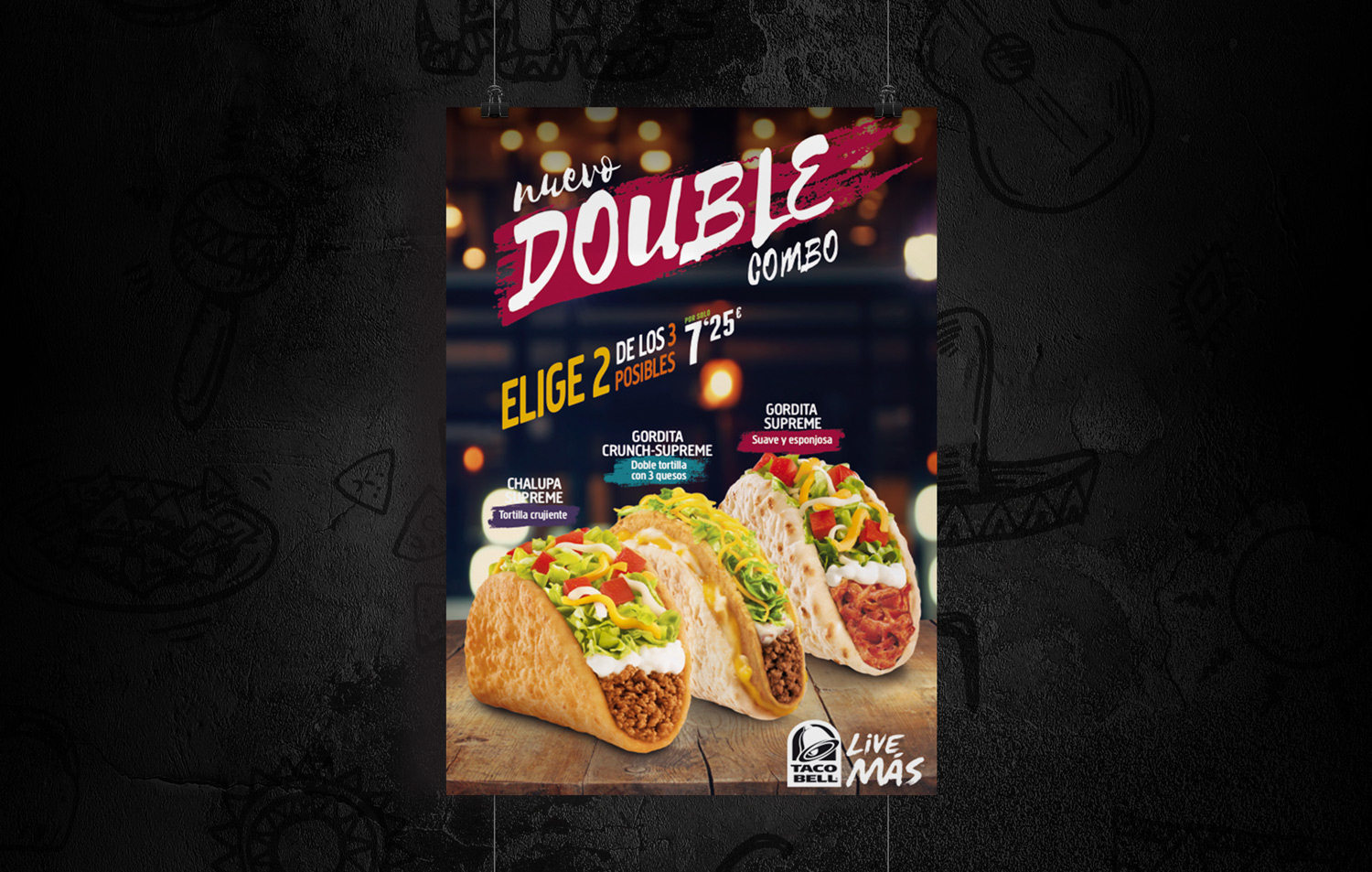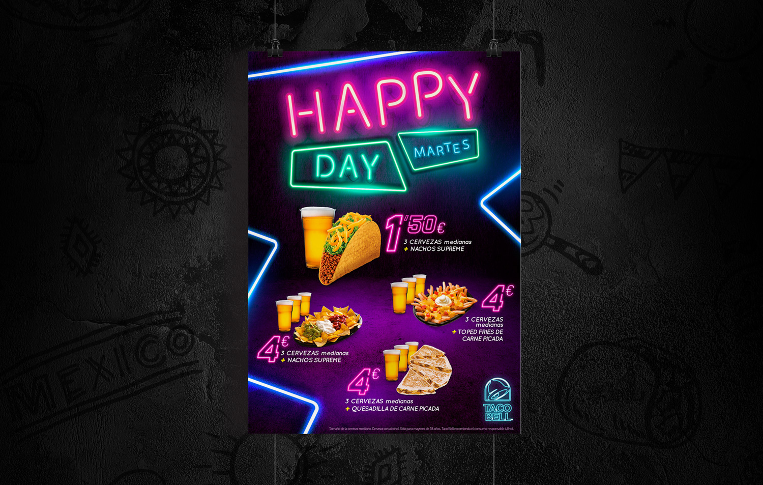 Durante más de tres años fui Head of Design para Taco Bell España desde agencia, liderando su diseño gráfico y visual en todos los puntos de contacto con el consumidor: desde los menuboards digitales que siguen presentes en sus locales hasta los concept visuals, campañas y lanzamientos de producto que marcaron su crecimiento en este mercado.