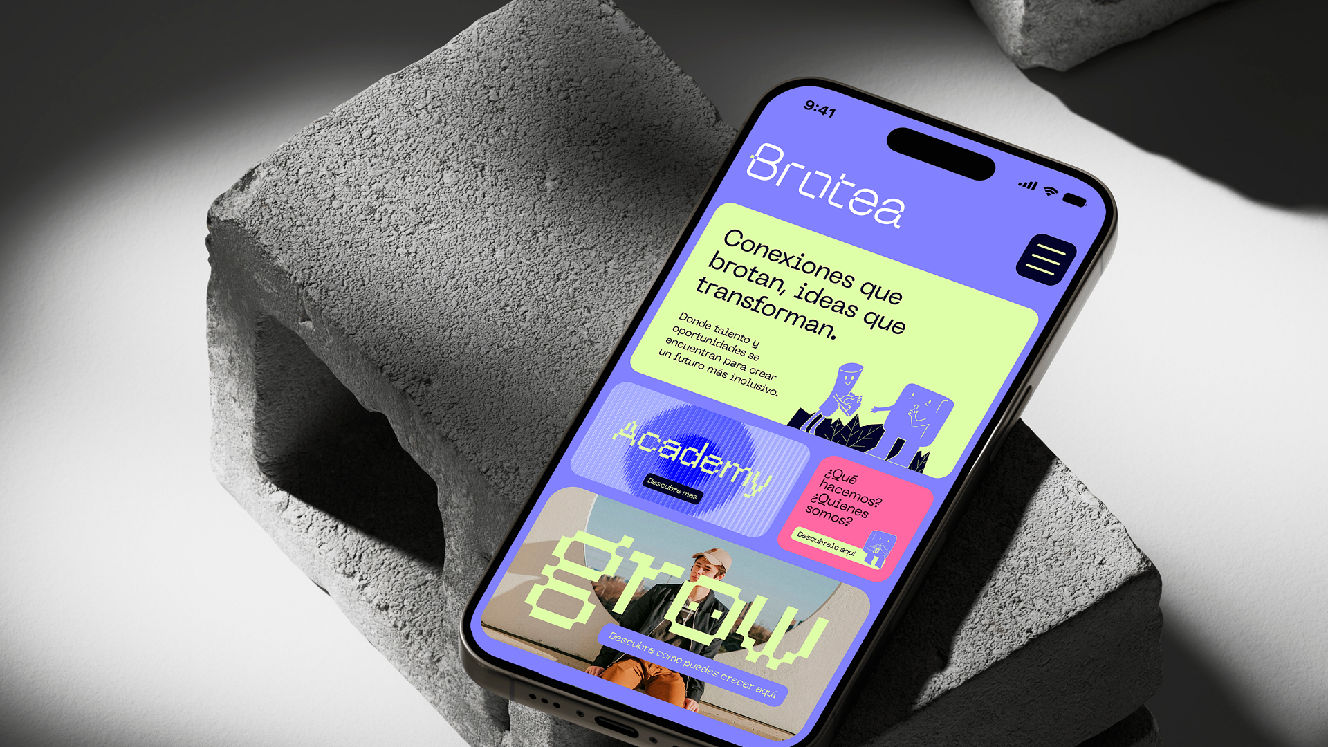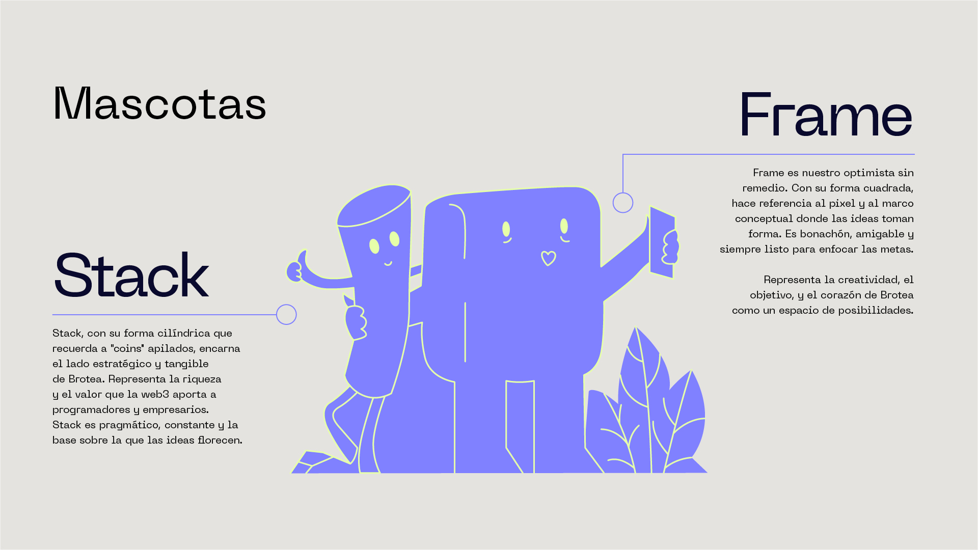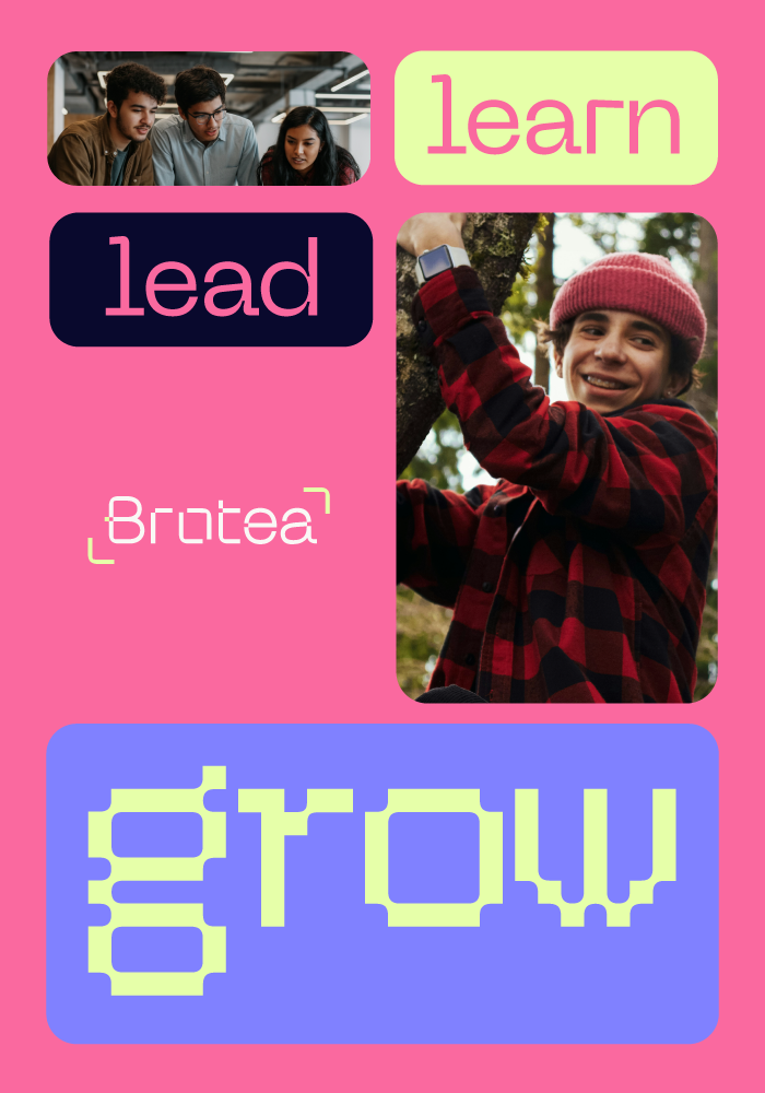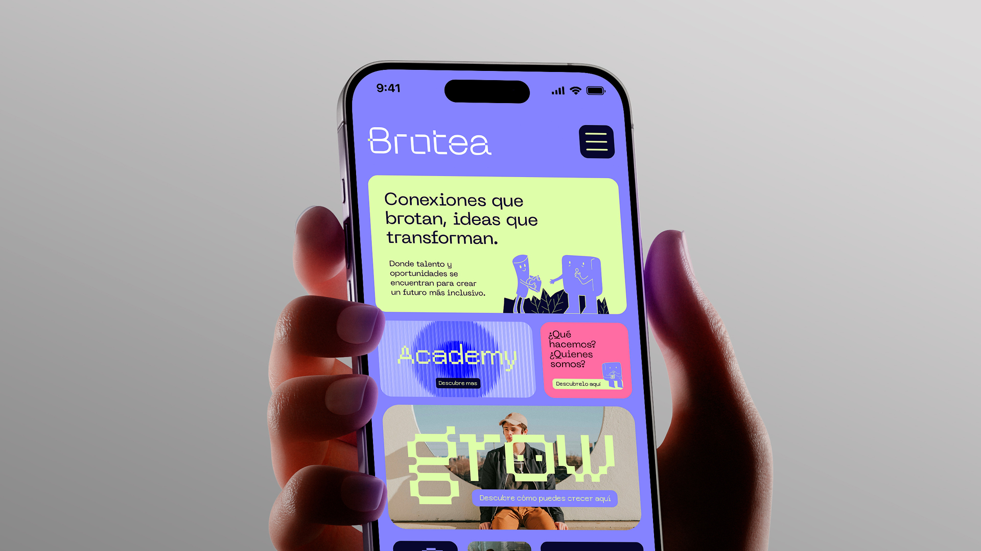 El tono de comunicación de Brotea es claro, accesible y motivador, alineado con su misión de acompañar a programadores y emprendedores en su desarrollo dentro del ecosistema Web3. COncepto que se hace tangible en el claim «Learn, Grow, Lead», reforzando refuerza cada una de estas etapas.