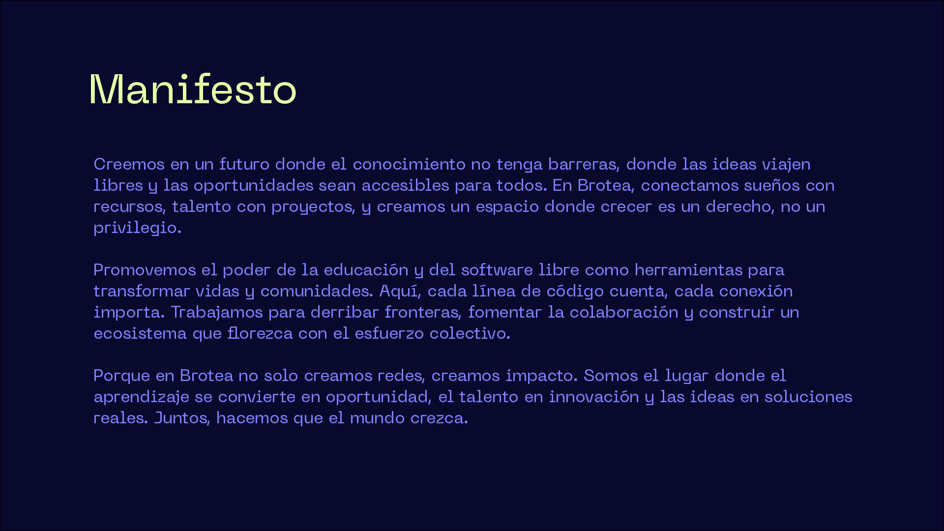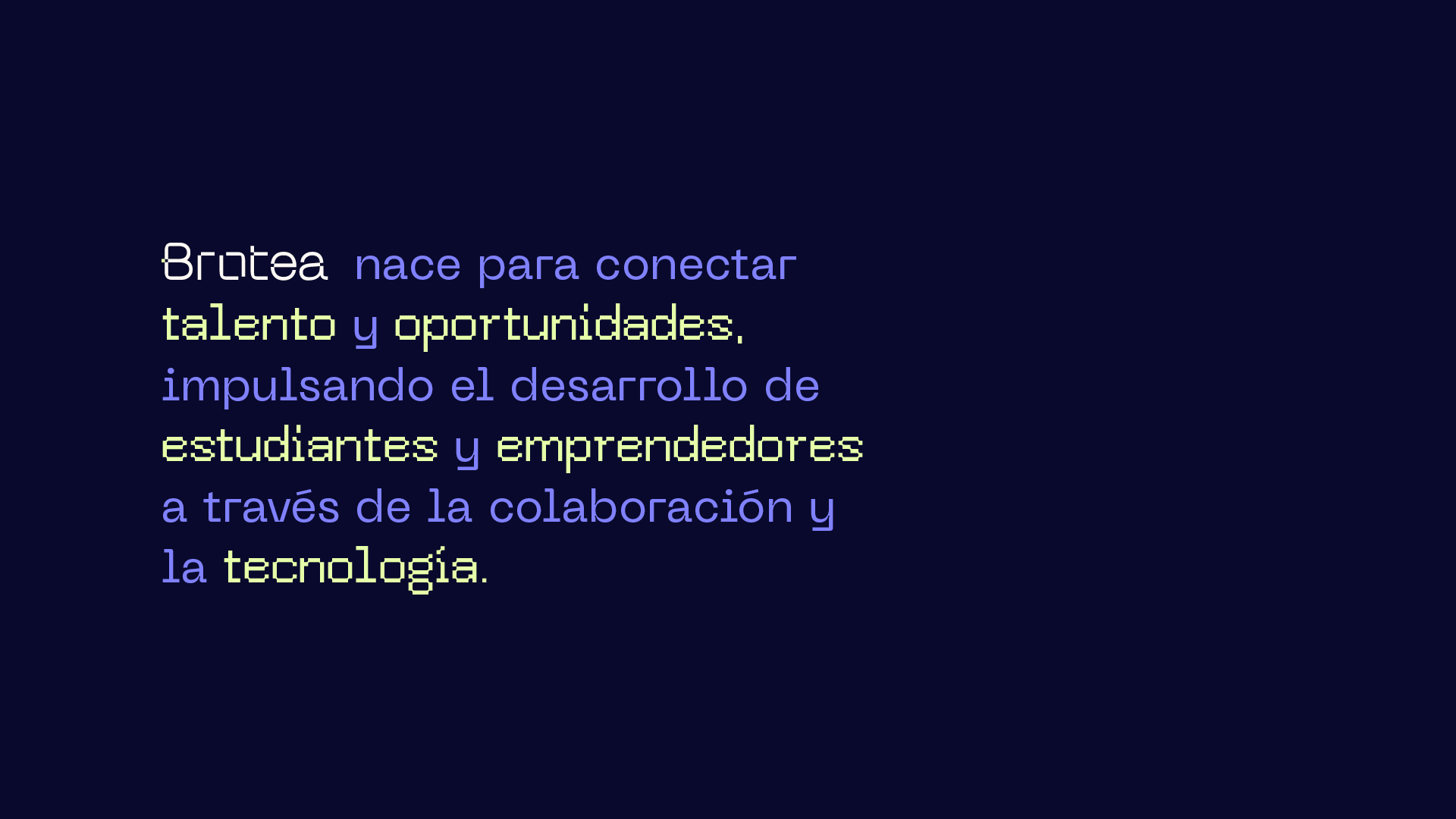 Brotea nace con una misión clara: conectar jóvenes programadores de Latinoamérica con emprendedores y empresas europeas que desarrollan proyectos en Web3 . En un ecosistema donde el talento emergente busca oportunidades y las startups tecnológicas carecen de recursos para contratar equipos completos, Brotea se posiciona como un intermediario estratégico. Su propuesta no es solo facilitar empleo, sino también guiar, estructurar y dar dirección a proyectos incipientes que requieren de liderazgo y conocimiento experto para materializarse.