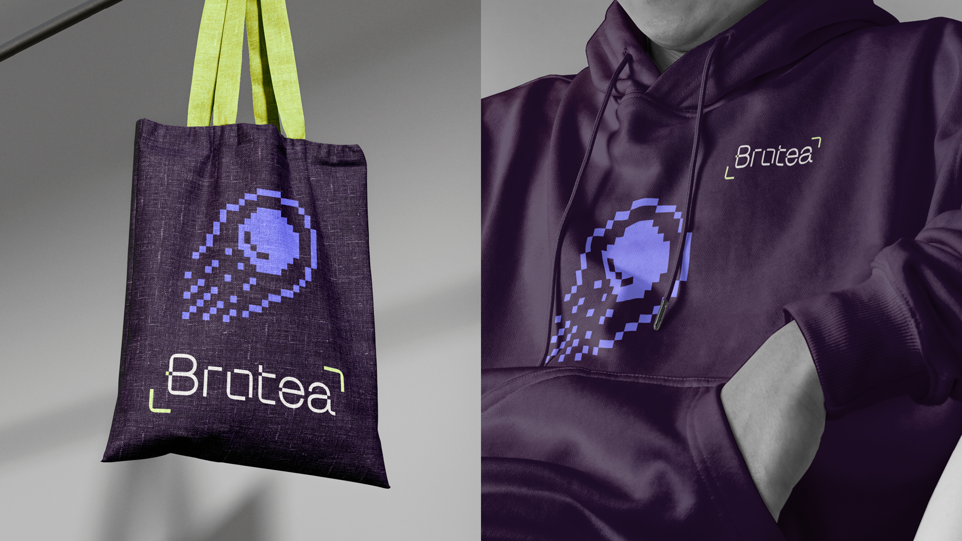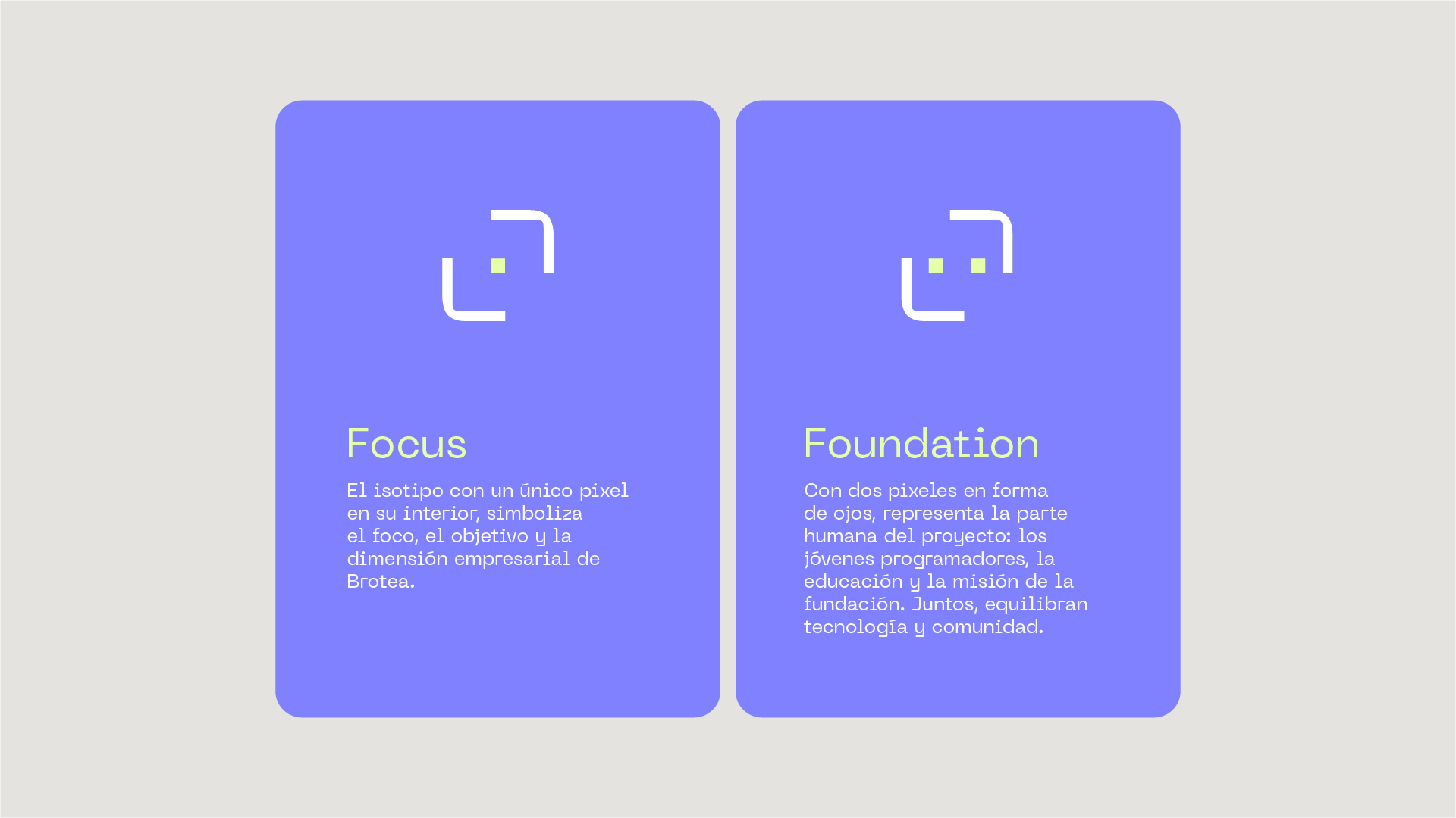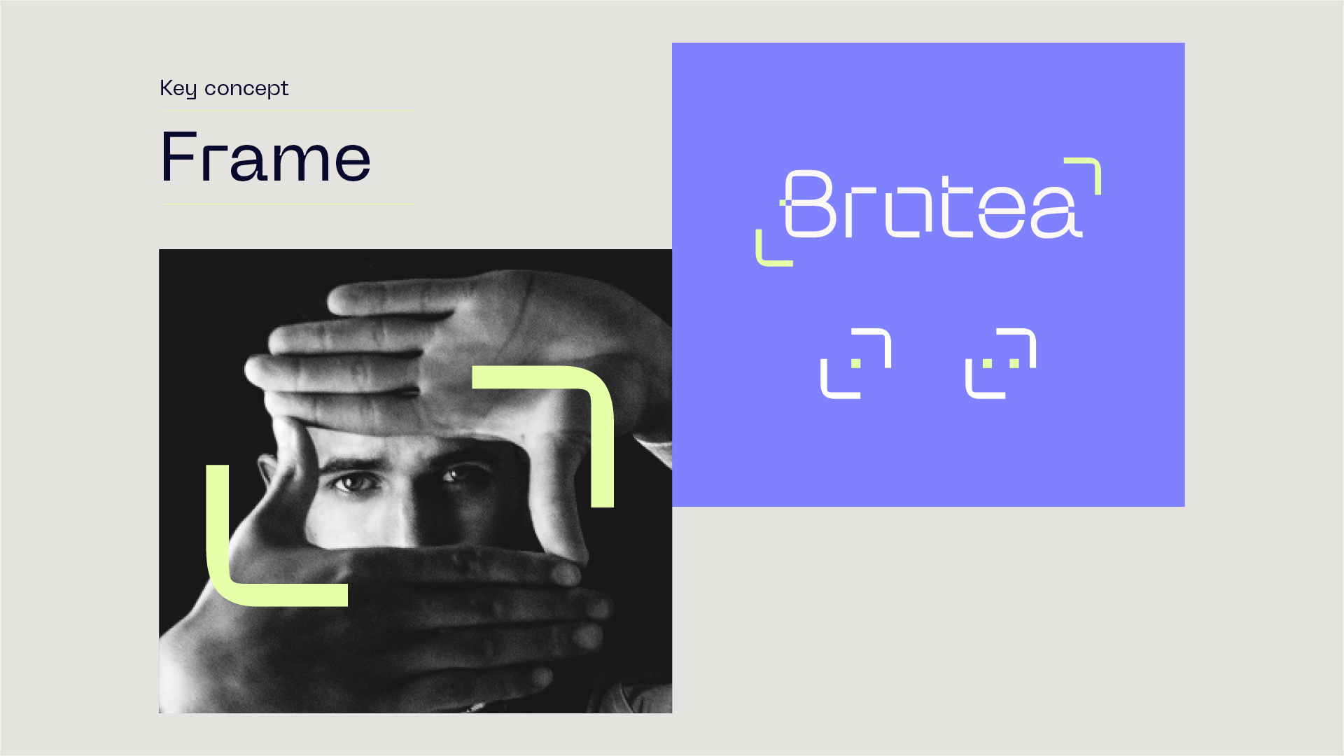 La esencia de Brotea nace del gesto universal de enmarcar con las manos, representando foco y dirección. Este concepto se materializa en el isotipo de la marca, un frame cuadrado con un pixel en su interior, que simboliza: