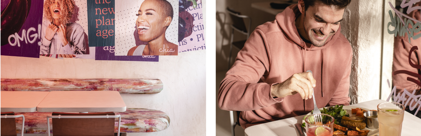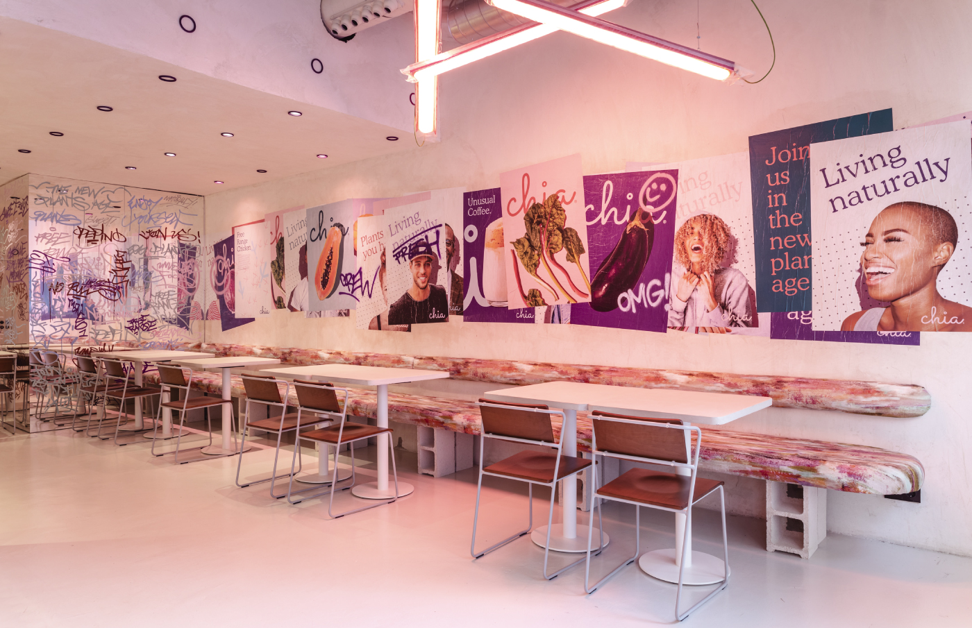 La paleta de colores elegida es un guiño a la diversidad de la gente de las ciudades y la también variada cantidad de opciones de la carta, que es inclusiva con opciones veganas, vegetarianas y gluten free.